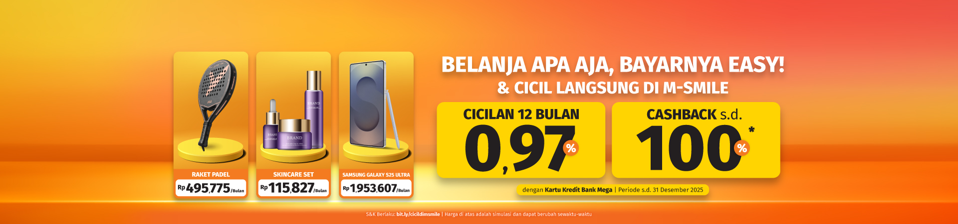 Dari fashion, gadget, hingga kebutuhan rumah tangga – semua transaksi retail kartu kredit kamu bisa dicicil dengan tenor fleksibel hingga 48 Bulan dengan mudah melalui M-Smile. Nikmati penawaran cashback spesial setiap transaksi yang diubah menjadi cicilan!