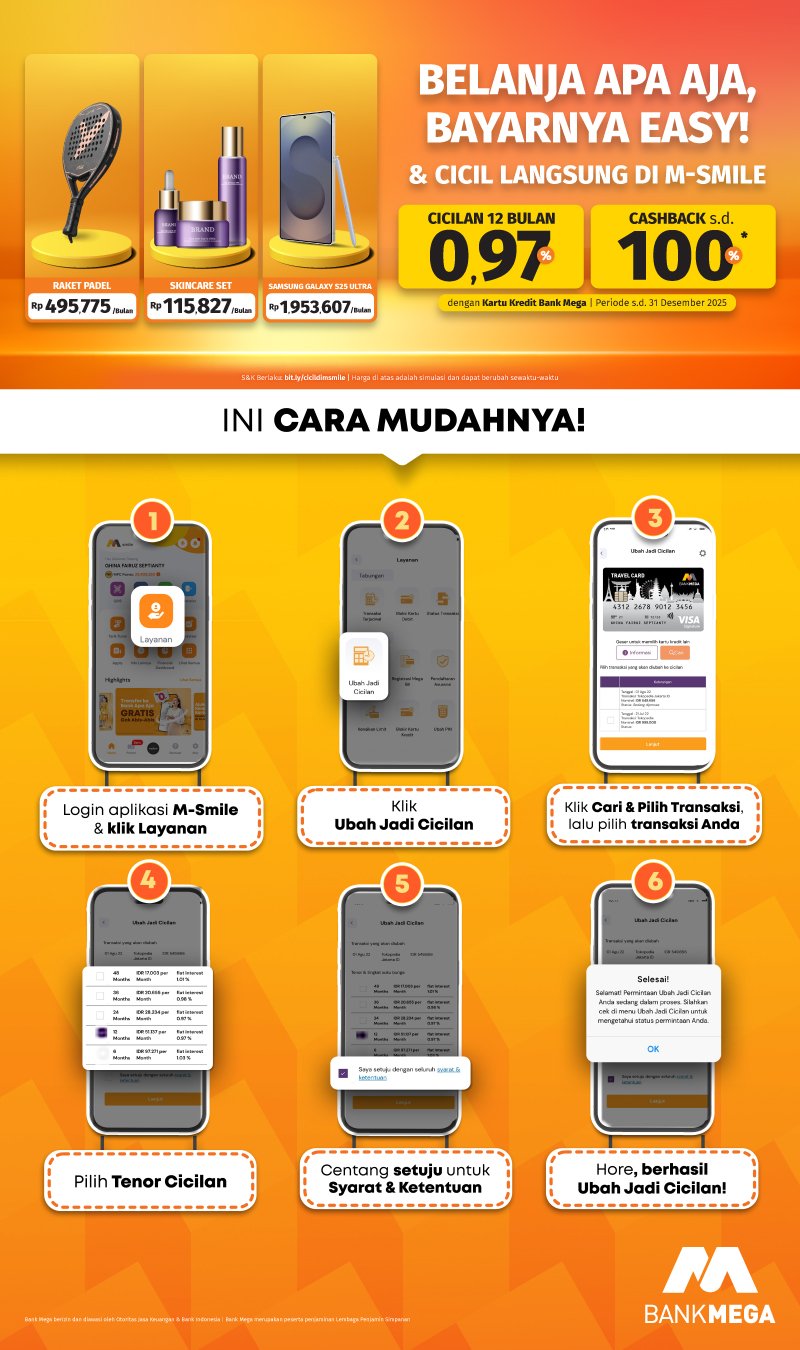 - Cashback 100% Admin Fee untuk 1 transaksi dengan admin fee terendah setiap 2 transaksiyang di ubah menjadi cicilan berlaku bagi Nasabah yang belum pernah melakukan ubah cicilan (Megapay) melalui aplikasi M-Smile. Cashback berlaku kelipatan sesuai dengan jumlah transaksi yang di ubah menjadi cicilan selama periode program.