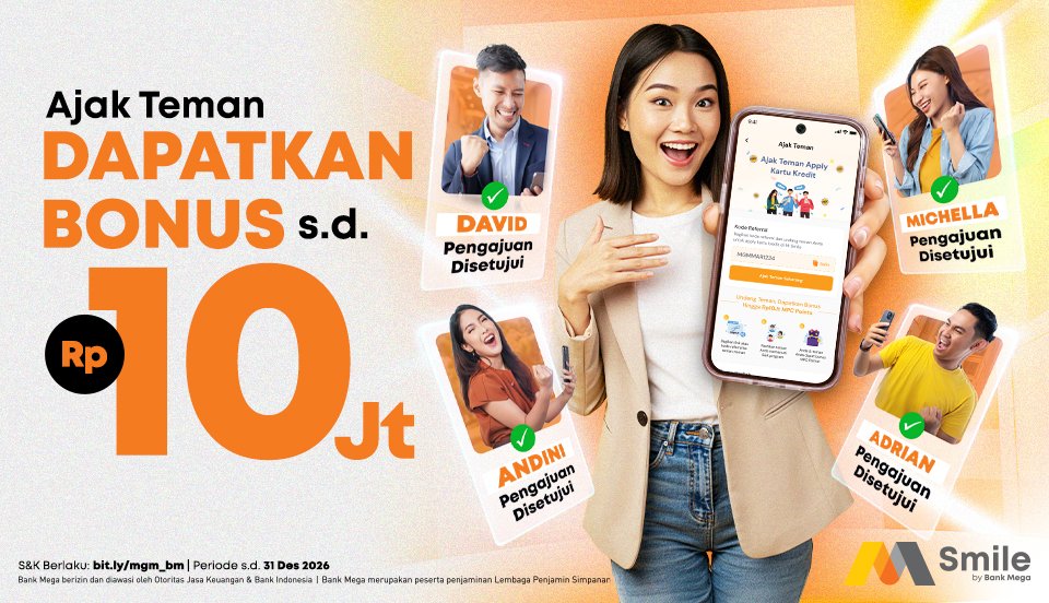 Siapa bilang kumpulin cuan itu susah? Dengan program Member Get Member, Anda bisa mengajak teman untuk ikut menikmati layanan kartu kredit Bank Mega dan mendapatkan bonus hingga Rp10 juta MPC Points! Mudah banget, cukup colek teman, rekomendasikan mereka untuk daftar, dan nikmati hadiahnya.