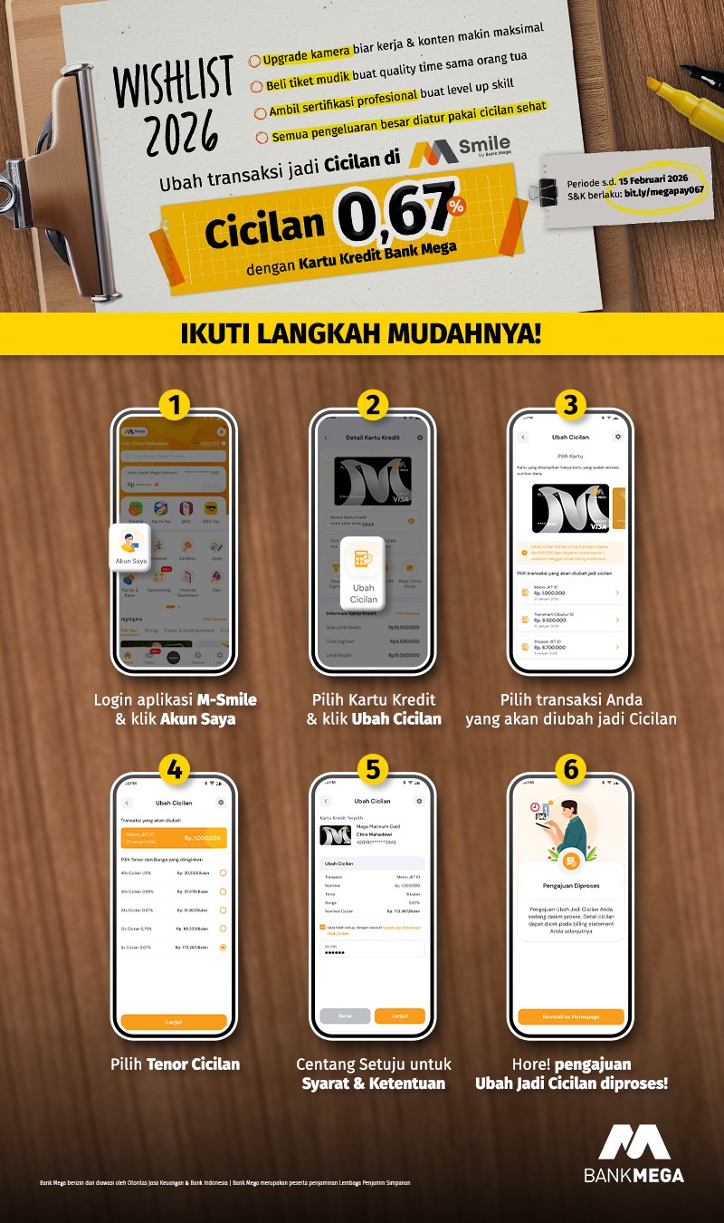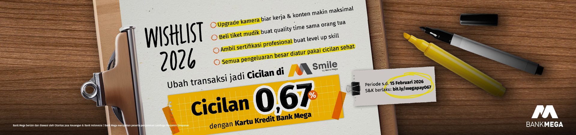 Rencana besar nggak harus ditunda. Dengan M-Smile, transaksi retail kartu kredit Bank Mega bisa diubah jadi cicilan 0,67% dan fleksibel hingga 48 bulan. Pengeluaran lebih teratur, wishlist tetap jalan.