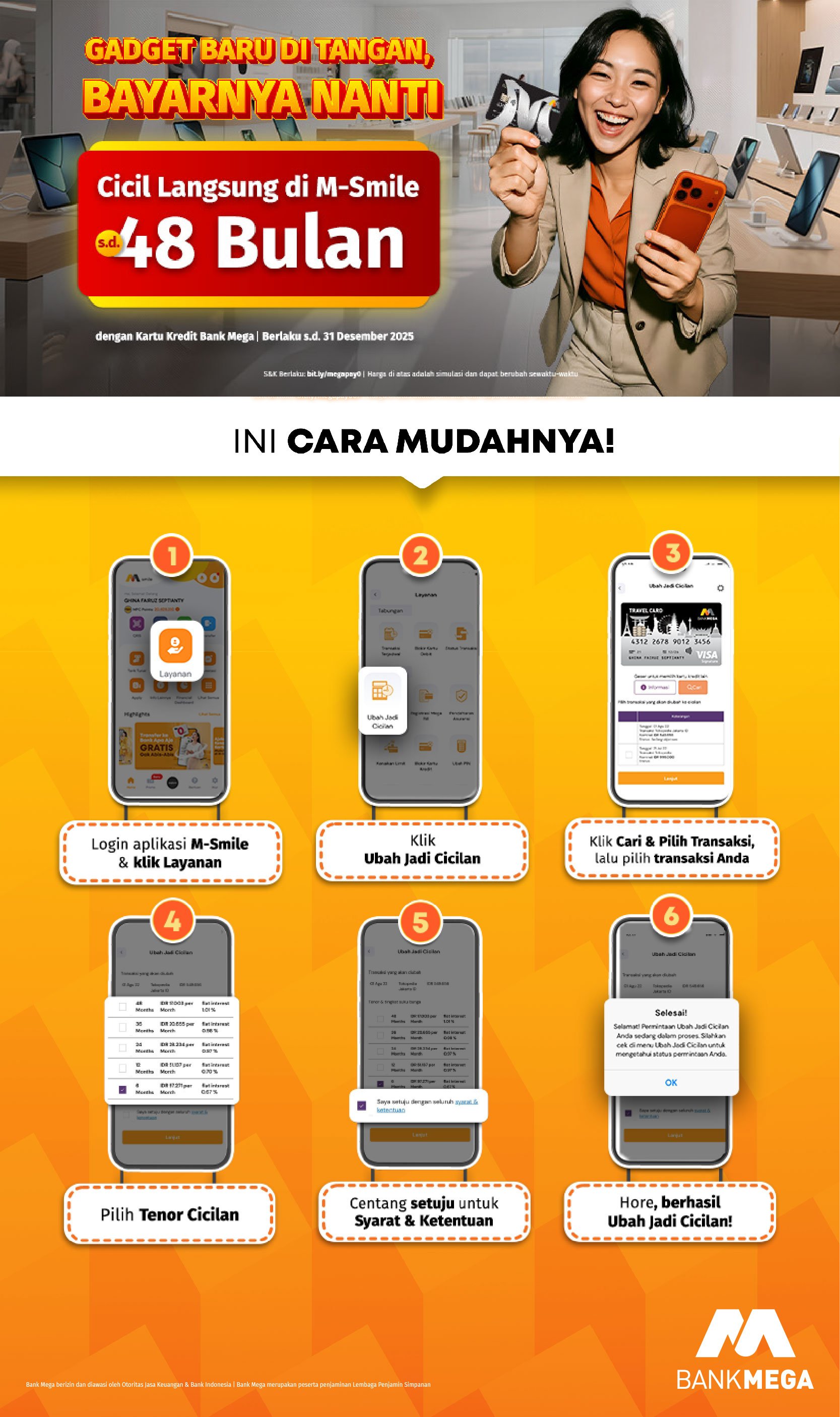 - Transaksi yang dapat diproses menjadi cicilan (MegaPay) adalah jenis Transaksi Retail dengan jumlah Minimum Rp500.000,- dan perubahan dapat dilakukan sebelum H-1 cetak billing.