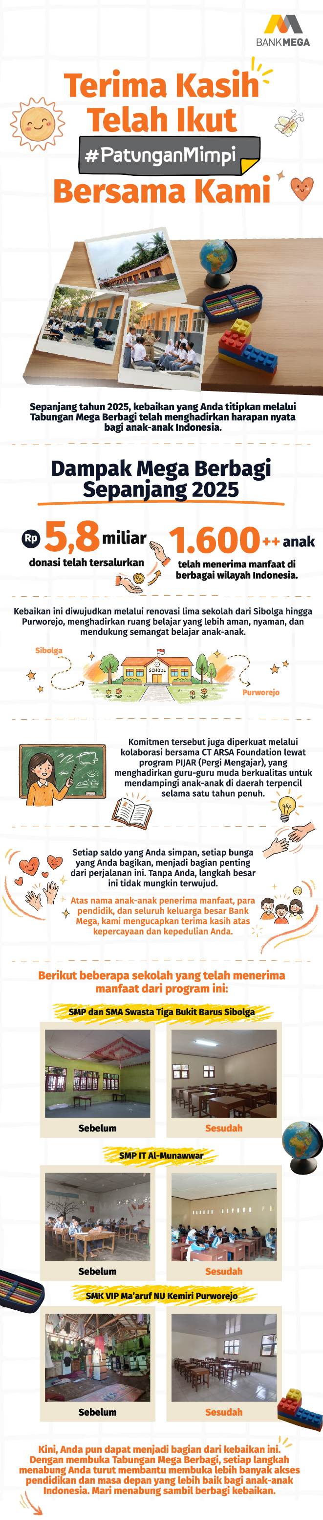 Program Mega Berbagi diluncurkan pertama kali pada tahun 2008, dan sejak saat itu telah banyak sekolah yang dibangun atau diperbaiki di seluruh Indonesia. Program Mega Berbagi telah membantu 14.934 anak bangsa untuk tetap bersemangat meraih masa depan mereka. Jika ada 1.000.000 nasabah yang bergabung dengan Mega Berbagi, maka akan ada lebih dari 438 sekolah yang akan dibangun, lebih dari 90.848 anak bangsa akan mendapatkan pendidikan yang lebih layak, dan yang terpenting, mereka akan memiliki masa depan yang lebih baik.