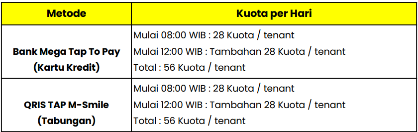 3. Hanya berlaku dengan metode pembayaran Bank Mega Tap To Pay dengan sumber dana Kartu Kredit Bank Mega atau metode pembayaran QRIS TAP dengan sumber dana Tabungan Bank Mega di aplikasi M-Smile.