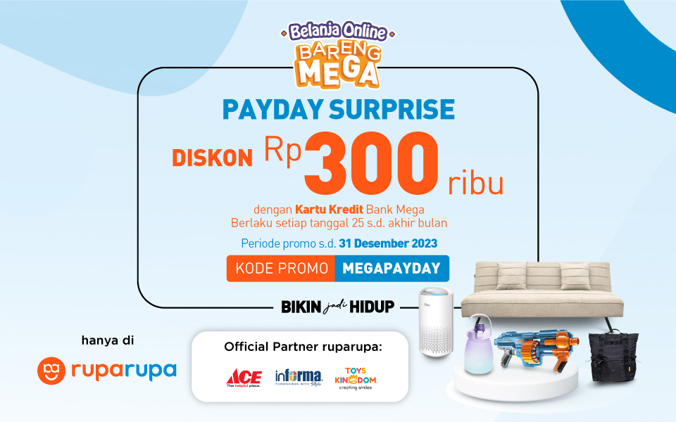 - Promo berlaku secara otomatis apabila Anda login ke akun ruparupa dan memasukkan kode promo MEGAPAYDAY, dan menggunakan nomor Kartu Kredit Bank Mega di halaman pembayaran.