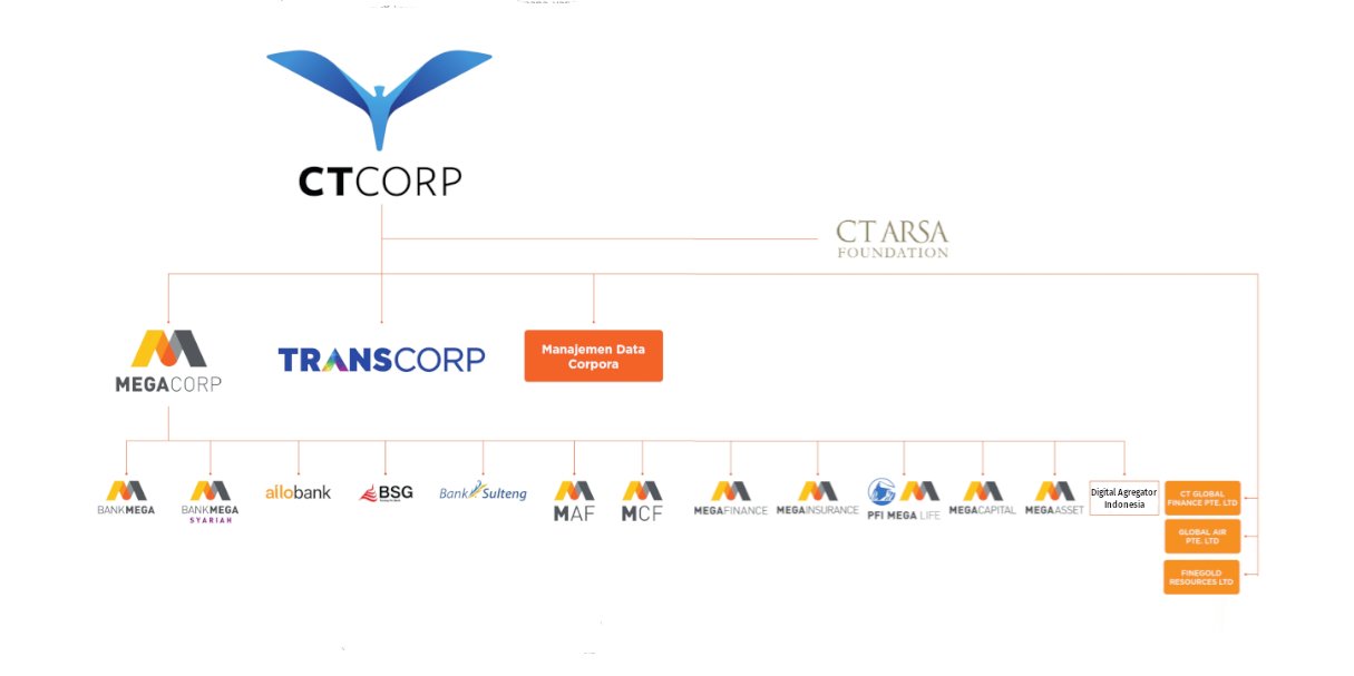 Mengacu kepada struktur bisnis PT CT Corpora (“CT Corp”), PT Mega Corpora merupakan pemegang saham mayoritas Bank Mega dan merupakan pilar usaha CT Corp yang membawahi unit usaha dibidang keuangan. Posisi PT Mega Corpora bersanding sejajar dengan dua kelompok pilar usaha lainnya, yaitu PT Trans Corpora yang bergerak dalam bidang media, lifestyle dan entertainment serta PT Manajemen Data Corpora. Ketiga kelompok perusahaan tersebut menjalankan aktivitas bisnis dengan saling bersinergi di dalam ekosistem CT Corp.